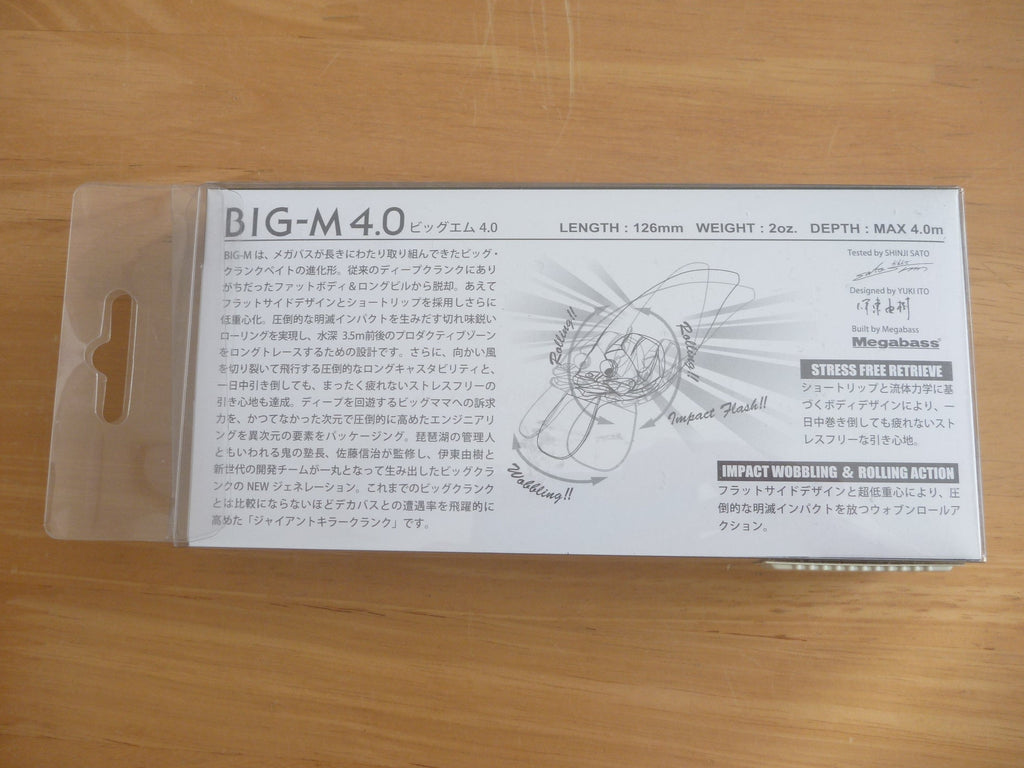 The BIG-M is the evolutionary result of many years of Megabass big crankbaits. It leaves behind the fat bodied and long billed design of past deep cranks, assuming a flat side design with a short lip and low center of gravity. It realizes sharp, rolling action that generates an overwhelming flashing impact. This design is meant to trace the productive zone at a range of 3.5m (11-12ft). It has incredible castability that allows it to slice through headwinds, combined with low-resistance retrieve which allows it to be used all day long with minimal fatigue. The BIG-M has the power to draw in big bass lurking in the depths, all contained within a package full of extraordinarily refined engineering. Developed under the guidance of Lake Biwa’s “manager,” Shinji Sato, Yuki Ito and the development team came together to produce this next generation big crank. This giant killer crank will dramatically increase contact rates with big bass.