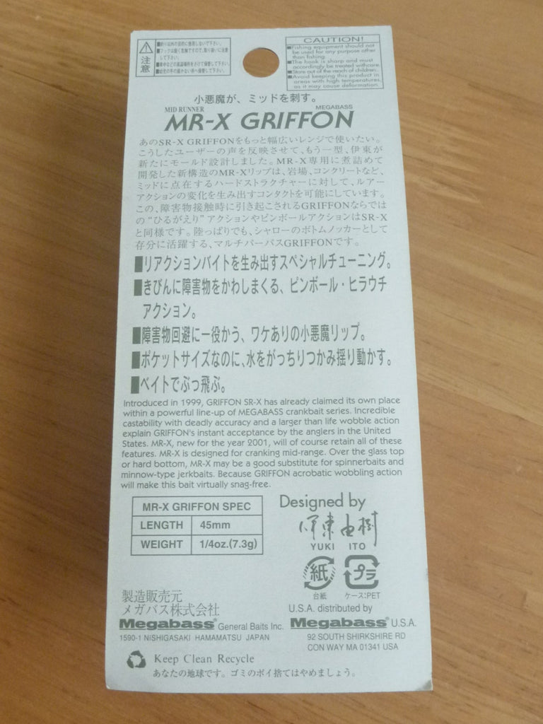 MR-X GRIFFON is a lure that enables first moving attacks in areas involving weed and grass tips and tops of submerged structure from 1.5m to 2.5m depth. In addition to mid-range grass fields, the lure makes good contact with riprap, laydowns, and other hard structure scattered throughout the mid-range, giving it the incredible obstacle avoidance ability that only GRIFFON can provide. The lure's extended lip reach creates GRIFFON's signature "fluttering" action and exciting pinball action in shallow and mid-range water. This lure is also very effective as a shallow bottom knocker on land.