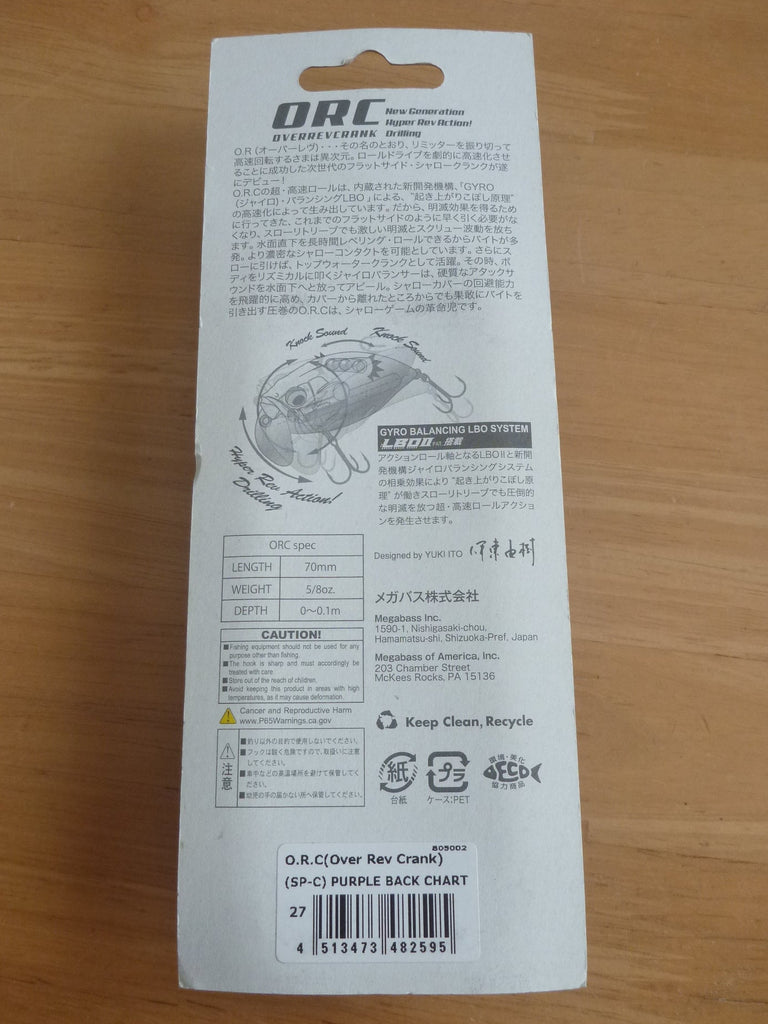 As the name OVER REV indicates, the limiter-breaking high-speed rotations of the ORC are next-level. Introducing a flat side shallow crank that has succeeded in dramatically increasing roll speed! The ORC’s super high-speed rolling is thanks to the newly developed GYRO BALANCING LBO mechanism that generates a high-speed wobbling roll like that of a roly-poly toy. This eliminates the need for the high-speed retrieves seen in previous flat sides which were needed to generate flashing. The ORC emits intense flashing and screw waves even during slow retrieves. It’s able to maintain a position directly under the surface for long periods of time, creating many opportunities to trigger bites. The ORC significantly raises the potential for contact with fish in shallow areas. If you retrieve it very slowly, it can perform as a topwater crank. In that situation, the GYRO BALANCER rhythmically strikes the body emitting a hard attack sound below the surface garnering attention from target fish. The ORC is a true shallow game revolutionary that features heightened shallow cover evasion performance and the ability to effectively draw out bites even when maintaining distance from cover.