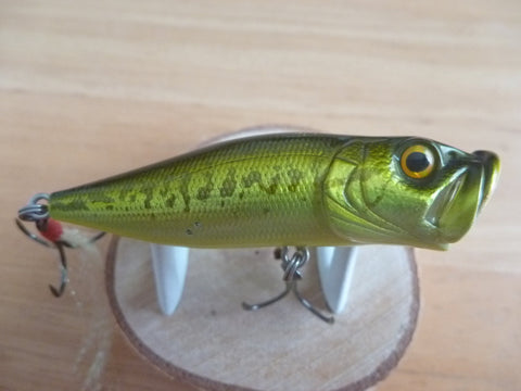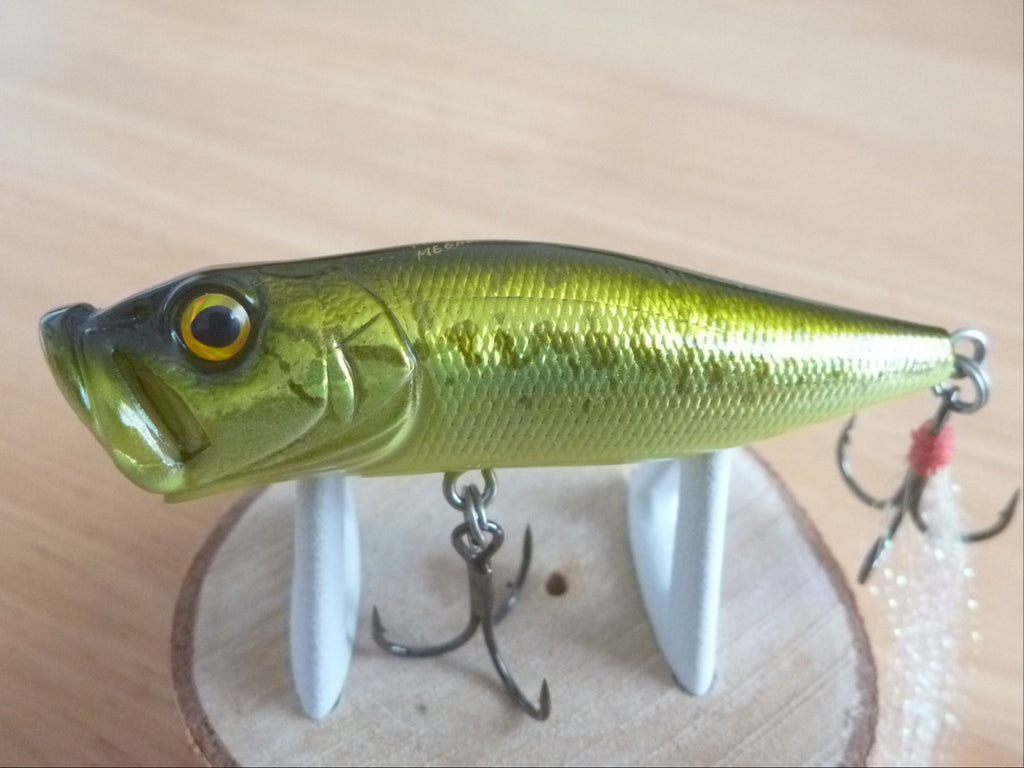 Introduced in 1996, POPX continues to dominate the high-end top-water bait markets of both Japan and the United States. Equipped with MEGABASS original SIDE-STEPPING BALANCER (PAT),POPX walks a rolling dog-walk unlike any other poppers, and the WATER DUCTS(PAT)which imitate the bubbly water coming out of gills and help create a natural"bio-sound", not an ordinary popping sound. POPX also spits, not splashes, quite a distance. Currently 16 colors are available."GG"stands for GUANIUM GHOST, the most shad-like finish, "PM"PEARL MICA(including SG CRACKED finish)and "GP"GUANIUM PHANTOM(including GP CRACKED finish),a see through phantom finish.