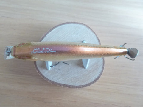 PROP DARTER 80 (X-80 PD) is something like top-water version of TRICK DARTER. The prop which was invented (PAT.P) just for this bait, is truly unique not simply because it is asymmetric but because of its lively swimming sound and its ability to spit back. As for the body, the inside structure has been completely overhauled and redesigned for a new set of objectives. As a result it leans to left and right when retrieved. It looks like a snake's swimming track. PROP DARTER has a lip, which tries to dive. Yet it cannot dive. This struggle adds to PROP DARTER's unique bio-sound and the surface action you have never seen before.