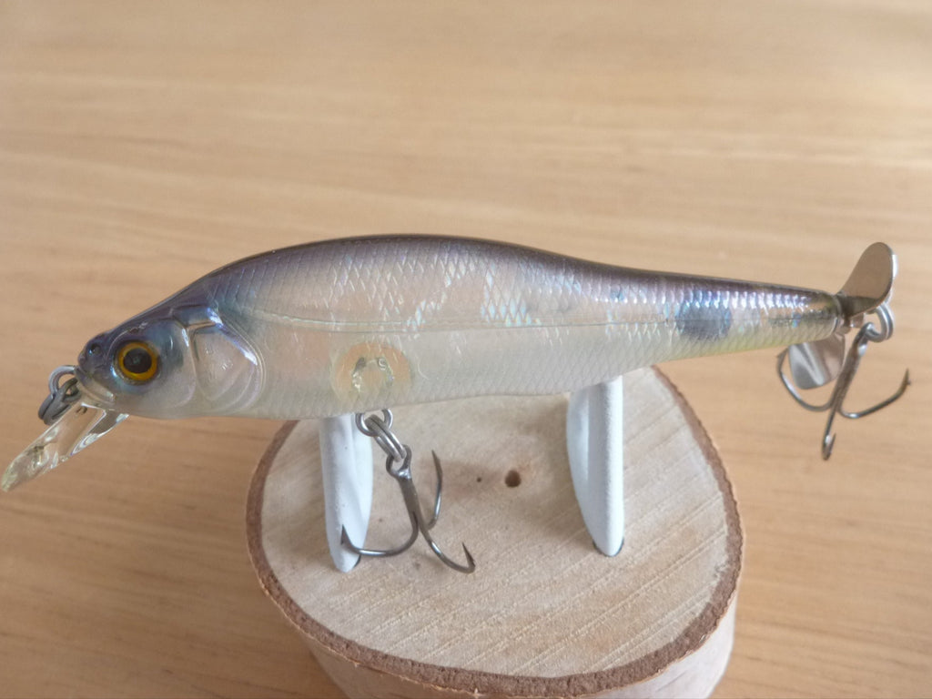 PROP DARTER 80 (X-80 PD) is something like top-water version of TRICK DARTER. The prop which was invented (PAT.P) just for this bait, is truly unique not simply because it is asymmetric but because of its lively swimming sound and its ability to spit back. As for the body, the inside structure has been completely overhauled and redesigned for a new set of objectives. As a result it leans to left and right when retrieved. It looks like a snake's swimming track. PROP DARTER has a lip, which tries to dive. Yet it cannot dive. This struggle adds to PROP DARTER's unique bio-sound and the surface action you have never seen before.