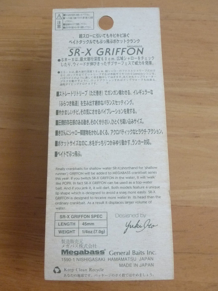 SR-X GRIFFON covers a range even lower than that of so-called ordinary shallow cranks. In other words, SR-X GRIFFON has been developed as a new generation shallow crank for multi-shallow range, which enables anglers to fish at depths from 0m to 1.3m in a wide range. The SR-X GRIFFON has an ultra C-class acrobatic action with amazing evasion ability when it comes into contact with structure, obstacles and the bottom, and it turns on shallow bass with a pinball-like painful movement. The SR-X GRIFFON has a much larger hitting surface than conventional crankbaits. Despite its small size, the SR-X GRIFFON moves a lot of water in the water and its "compact size" + "super impact" results are unrivaled.