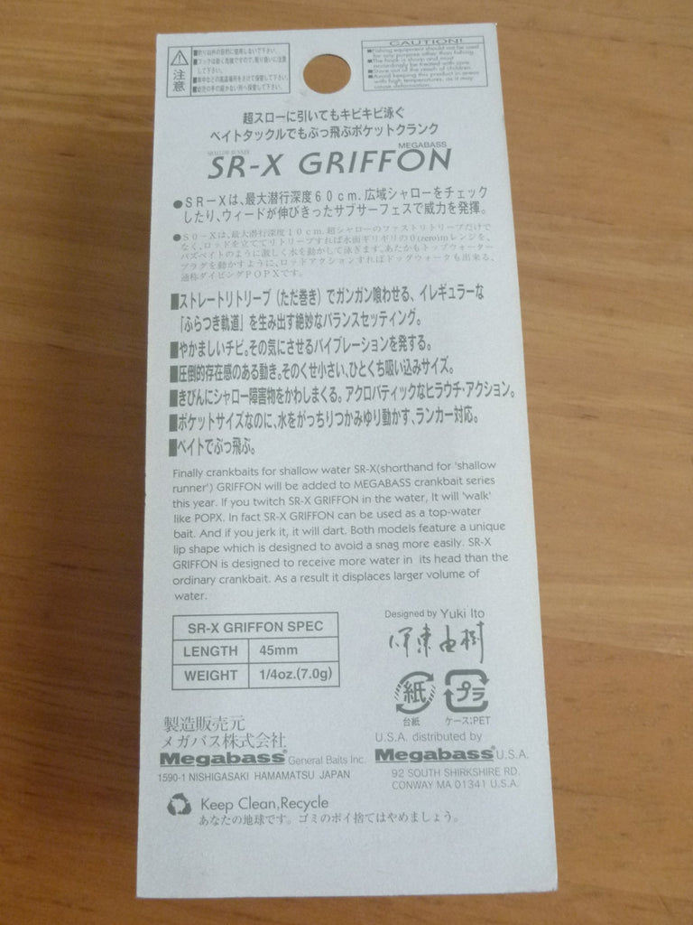 SR-X GRIFFON covers a range even lower than that of so-called ordinary shallow cranks. In other words, SR-X GRIFFON has been developed as a new generation shallow crank for multi-shallow range, which enables anglers to fish at depths from 0m to 1.3m in a wide range. The SR-X GRIFFON has an ultra C-class acrobatic action with amazing evasion ability when it comes into contact with structure, obstacles and the bottom, and it turns on shallow bass with a pinball-like painful movement. The SR-X GRIFFON has a much larger hitting surface than conventional crankbaits. Despite its small size, the SR-X GRIFFON moves a lot of water in the water and its "compact size" + "super impact" results are unrivaled.