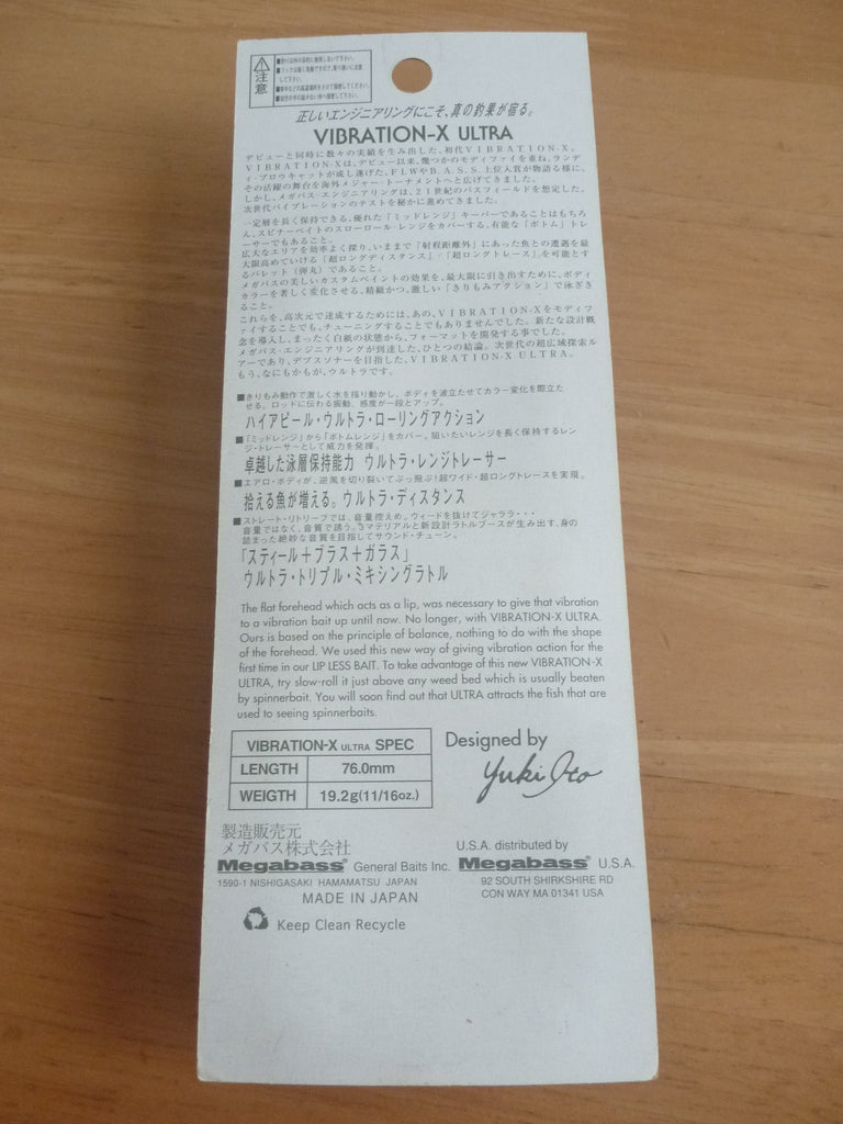 The Ultra does not have the flat head traditionally found on vibration lures. It uses a hydrodiffusing body foam that acts according to Megabass' unique balance vector, which has been put to practical use in lipless baits. The Ultra not only enables a constant layer of keep contact, but also a keep contact against more unknown deep layers that conventional vibrations could not trace. The Ultra's high-speed rolling action not only creates extremely sharp vibrations, but also makes the water displacement created by agitating water different. The ultra rolling action also creates a wavy tone change on the body surface for maximum visual effect.