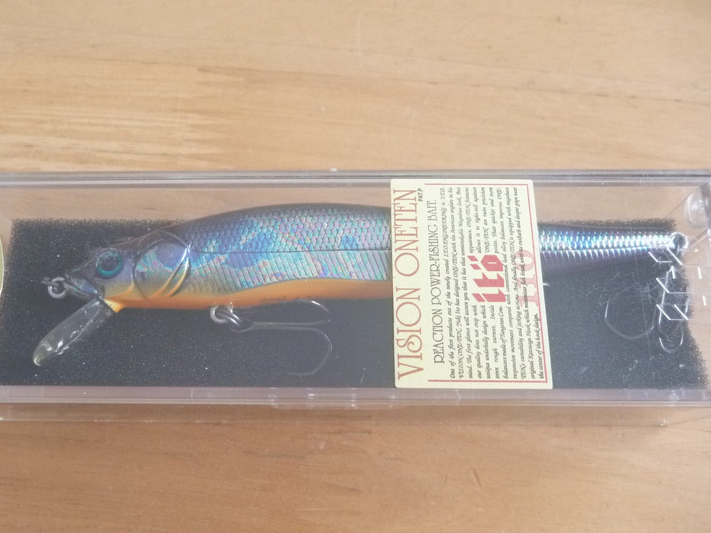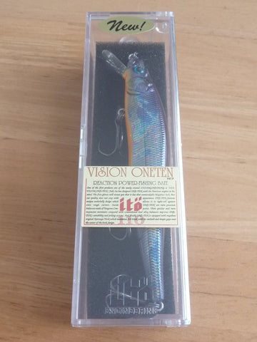 Introduced in the fall of 2000, the VISION ONETEN immediately captured the imagination of American anglers, setting a new standard for jerk baits. Designed by Yuki Ito for anglers in the United States, the ONETEN has emerged as the "go-to" jerk bait amongst touring pros, continuing to produce key fish and big checks from the Club level to the Bassmaster Classic. The profile, one-of-a-kind darting action, tungsten Multi-Way Moving Balancer System (PAT.) and hand-painted color patterns all contribute to the incredible fish-catching ability of the VISION ONETEN. The internal balancer system not only fuels the ONETEN's unparalleled action and huge flashes, but also allows it to cast like a bullet, far outpacing conventional jerk baits. This deadly package is finished off with three Megabass original sticky-sharp KATSUAGE OUT-BARB treble hooks, designed to increase hook-setting percentages when power-bait fishing. Crafted to generate results with a steady retrieve, traditional "jerk, jerk, pause," or trolling, the ONETEN responds to rod actions with unparalleled, life-like action. The one and only: VISION ONETEN.