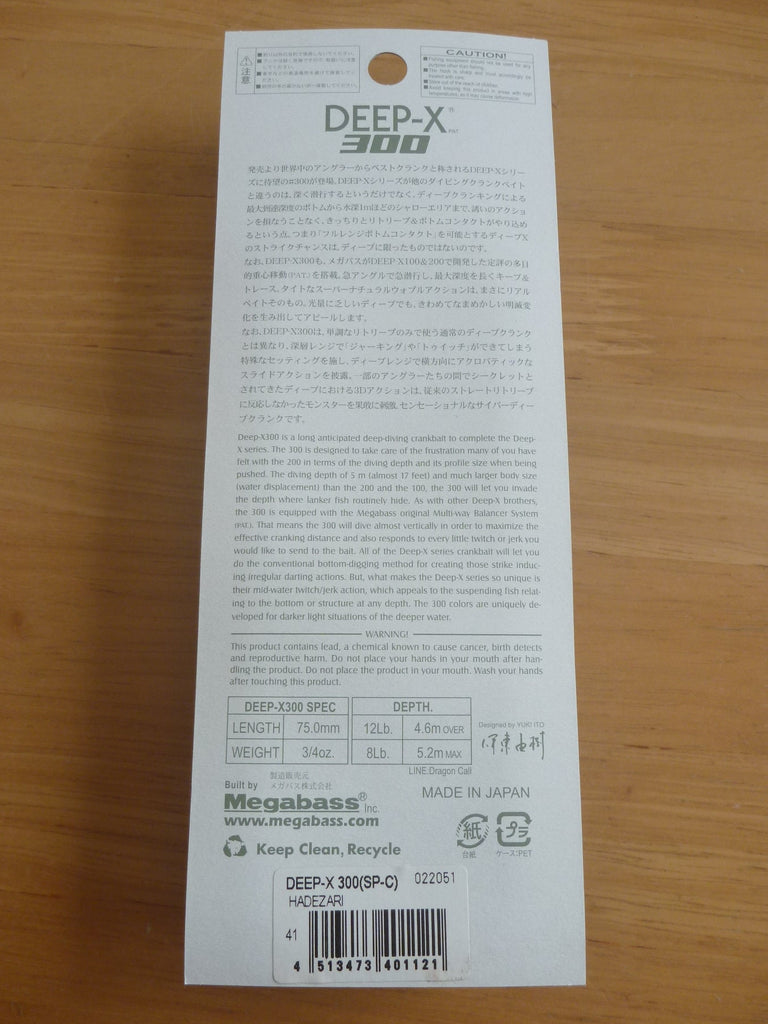 The DEEP-X300 is a long anticipated deep-diving crank bait that adds dimension to the DEEP-X series. With a diving depth of 5m (almost 17 feet) and a much larger body size than the 200 and the 100, the DEEP-X300 will let you invade the depths where lunker fish routinely hide. As with its other DEEP-X brothers, the 300 is equipped with the MULTI-WAY MOVING BALANCER SYSTEM(PAT.). That means the 300 will dive almost vertically in order to maximize effective cranking distance and will also respond to every little twitch or jerk you send to the bait. All of the DEEP-X series crank baits will allow for the conventional bottom-digging method for creating those strike-inducing irregular darting actions, but what makes the DEEP-X series so unique is their mid-water twitch/jerk action, which appeals to the fish at any depth. The 300's colors are uniquely developed for the lower light environment of deeper water.