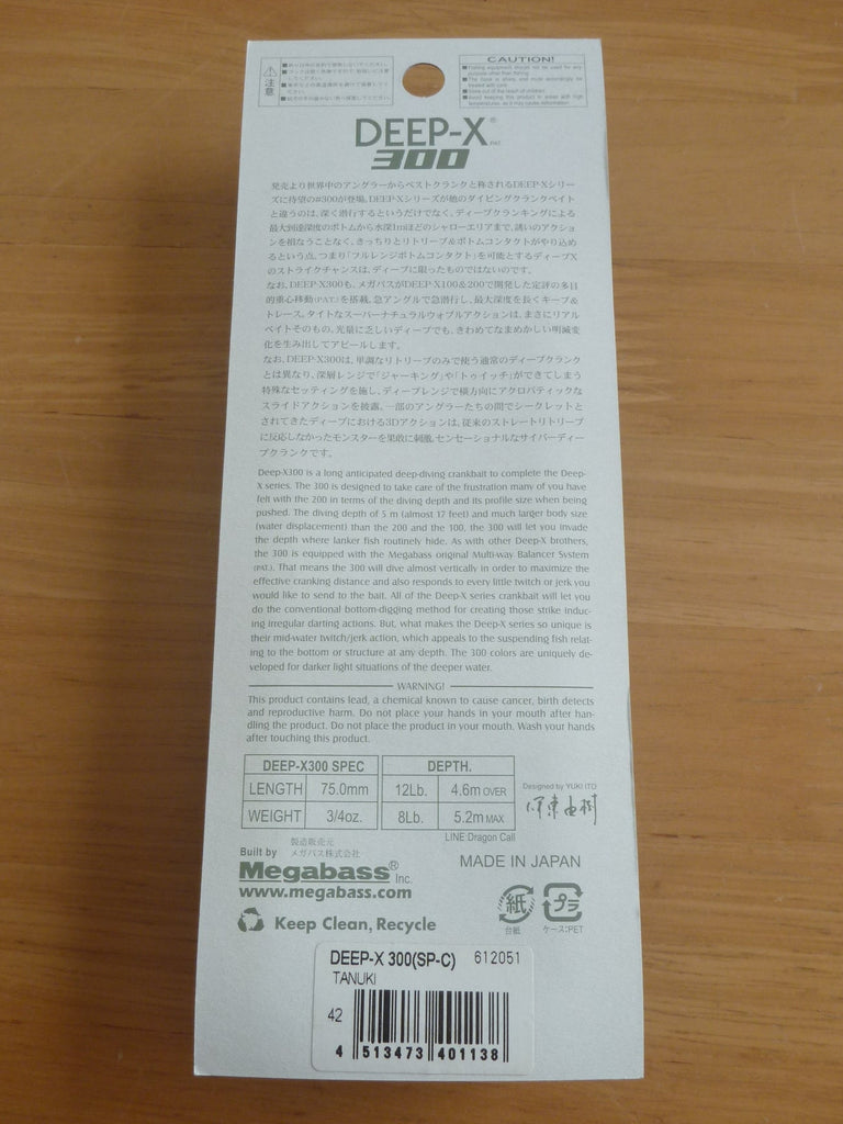 The DEEP-X300 is a long anticipated deep-diving crank bait that adds dimension to the DEEP-X series. With a diving depth of 5m (almost 17 feet) and a much larger body size than the 200 and the 100, the DEEP-X300 will let you invade the depths where lunker fish routinely hide. As with its other DEEP-X brothers, the 300 is equipped with the MULTI-WAY MOVING BALANCER SYSTEM(PAT.). That means the 300 will dive almost vertically in order to maximize effective cranking distance and will also respond to every little twitch or jerk you send to the bait. All of the DEEP-X series crank baits will allow for the conventional bottom-digging method for creating those strike-inducing irregular darting actions, but what makes the DEEP-X series so unique is their mid-water twitch/jerk action, which appeals to the fish at any depth. The 300's colors are uniquely developed for the lower light environment of deeper water.