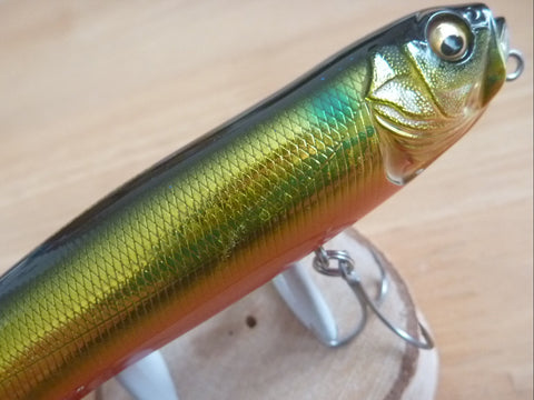 DOG-X DIAMANTE SW has an overwhelming feeding impact on surface-oriented saltwater targets such as sea bass. Anyone can easily control the 180° table turn, dog walk, and long skating. It produces a variety of effects on a wide range of fleeing baits. Deeply carved deep-cut keel sharply increases action response and produces a lively splash. This promotes feeding. With its aerodynamic body form and unique setting that significantly increases its weight compared to the original Diamante, it can stand up to the winds that blow across the ocean and estuaries with impressive long castability. The DOG-X DIAMANTE SW will change the top water game in the ocean, creating even more exciting drama.
