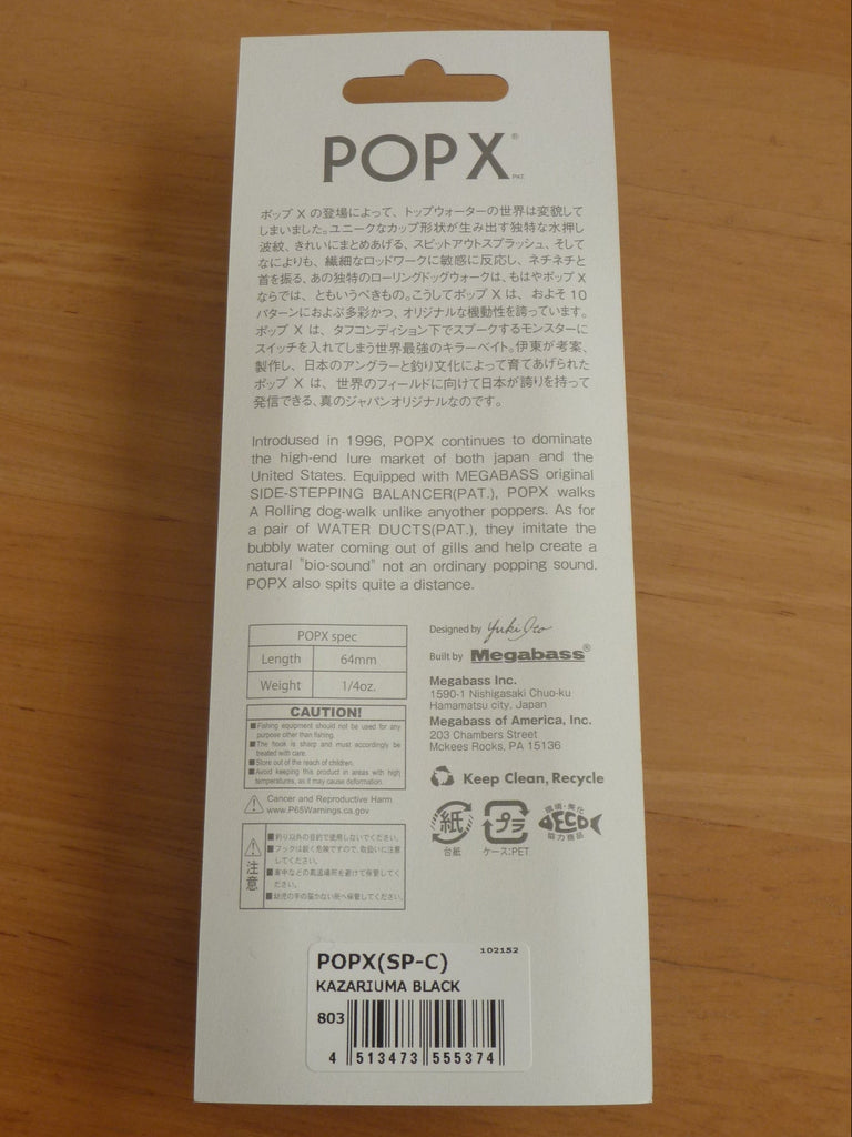 Introduced in 1996, POPX continues to dominate the high-end top-water bait markets of both Japan and the United States. Equipped with MEGABASS original SIDE-STEPPING BALANCER (PAT),POPX walks a rolling dog-walk unlike any other poppers, and the WATER DUCTS(PAT)which imitate the bubbly water coming out of gills and help create a natural"bio-sound", not an ordinary popping sound. POPX also spits, not splashes, quite a distance. Currently 16 colors are available."GG"stands for GUANIUM GHOST, the most shad-like finish, "PM"PEARL MICA(including SG CRACKED finish)and "GP"GUANIUM PHANTOM(including GP CRACKED finish),a see through phantom finish.