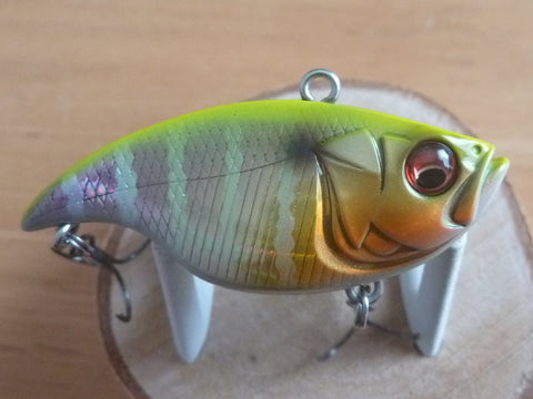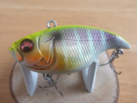 It has a realistic bite-size silhouette, ultra-high pitch vibrations with a violent roll, an overwhelming flying distance, excellent structure avoidance performance, and instantaneous swimming. The internal weight is designed to have an extremely low center of gravity for maximum stability, and a depressed cup on the nose is designed to collect and capture water to maximize responsiveness of the action. The lure has an overwhelmingly good swimming action that chases bass as soon as the retrieve starts, and instantly produces strong wave action and super-fast flickering that surpasses that of conventional small vibrators.
