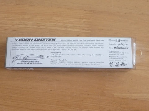 Introduced in the fall of 2000, the VISION ONETEN immediately captured the imagination of American anglers, setting a new standard for jerk baits. Designed by Yuki Ito for anglers in the United States, the ONETEN has emerged as the "go-to" jerk bait amongst touring pros, continuing to produce key fish and big checks from the Club level to the Bassmaster Classic. The profile, one-of-a-kind darting action, tungsten Multi-Way Moving Balancer System (PAT.) and hand-painted color patterns all contribute to the incredible fish-catching ability of the VISION ONETEN. The internal balancer system not only fuels the ONETEN's unparalleled action and huge flashes, but also allows it to cast like a bullet, far outpacing conventional jerk baits. This deadly package is finished off with three Megabass original sticky-sharp KATSUAGE OUT-BARB treble hooks, designed to increase hook-setting percentages when power-bait fishing. Crafted to generate results with a steady retrieve, traditional "jerk, jerk, pause," or trolling, the ONETEN responds to rod actions with unparalleled, life-like action. The one and only: VISION ONETEN.